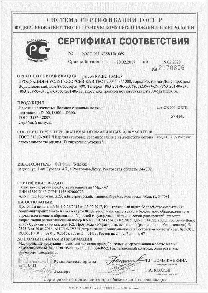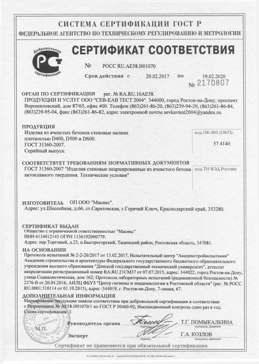 Плотность газобетона Masix D500 составляет 500 кг/м3. Это означает, что газобетонный блок имеет среднюю плотность, что обеспечивает оптимальное соотношение прочности и теплоизоляционных свойств.